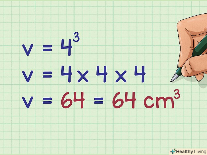 У формулу підставте значення ребра куба.це значення Ви знайшли за відомою площі поверхні куба.- Наприклад, якщо ребро куба дорівнює 4 см, формула запишеться так:
