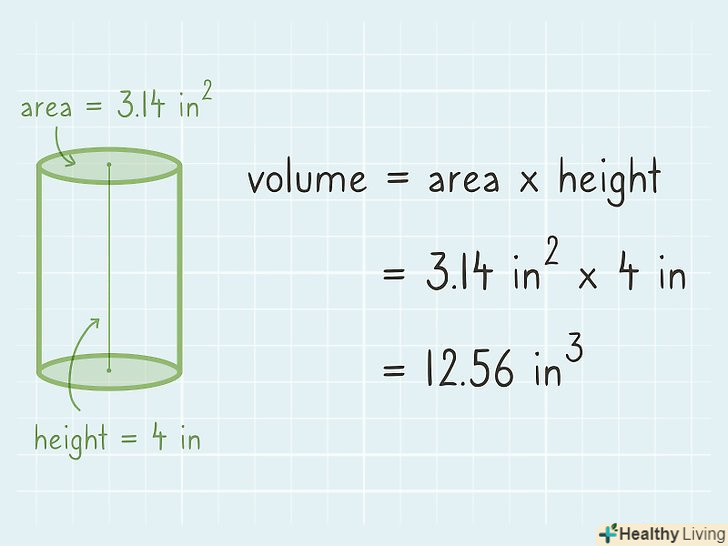 Помножте площу основи на висоту, щоб знайти об'єм циліндра. площа основи дорівнює 3,14 см2 , а Висота – 4 см, тому 3,14 см2 x 4 см = 12,56 см3- Обсяг вимірюється в кубічних одиницях, так як це величина, що характеризує об'ємні (тривимірні) фігури.