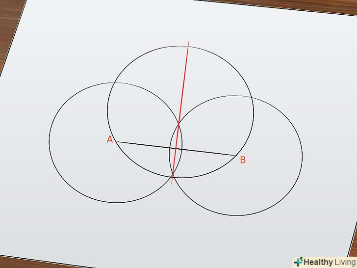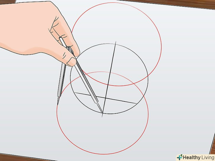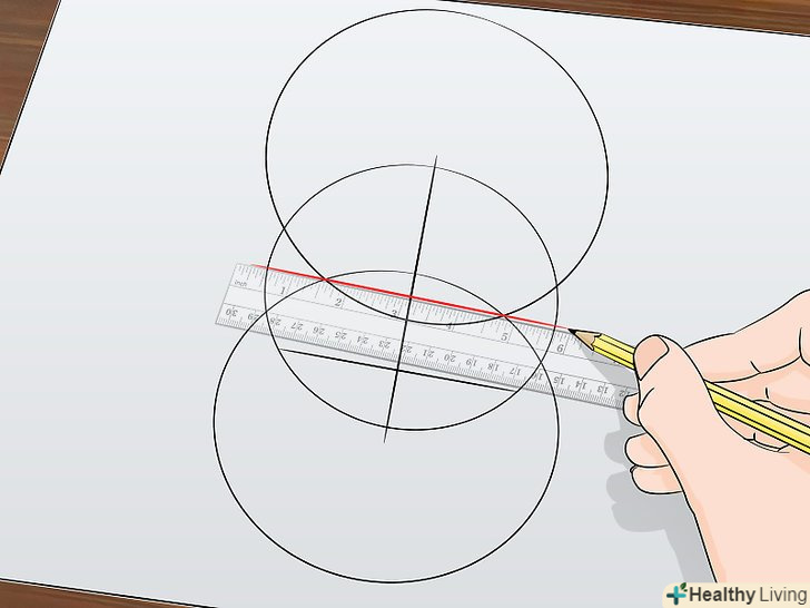 Проведіть вертикальну пряму через точки перетину накреслених кіл.окружності будуть перетинатися в двох точках, які розташовані одна над іншою. Проведіть пряму за допомогою лінійки; переконайтеся, що обидві точки лежать на цій прямій. Точки, в яких ця пряма перетинає вихідну окружність, позначте як С і D. відрізок СD є діаметром вихідної окружності.