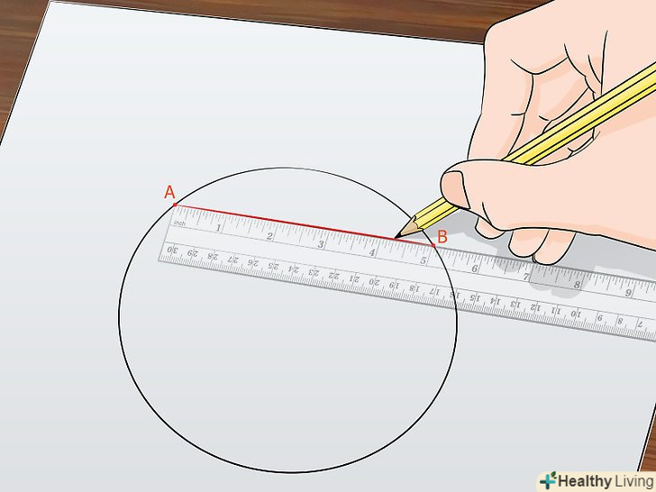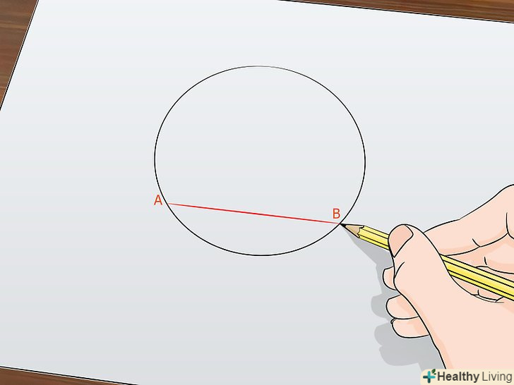 Проведіть хорду.Хорда-це відрізок, що з'єднує будь-які дві точки, що лежать на окружності, і не проходить через центр кола.[2] позначте цю хорду як ав.- Проводите прямі і відрізки за допомогою олівця, щоб мати можливість стерти їх після знаходження центру кола. Не тисніть на олівець, щоб вам було легше стерти намальовані лінії.