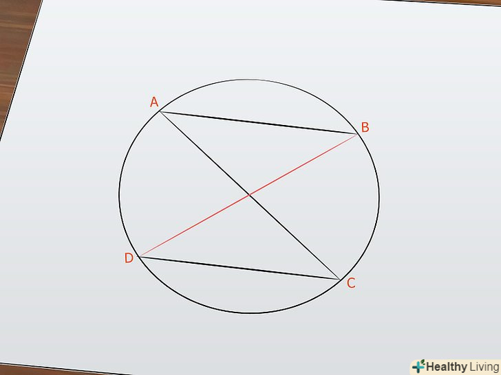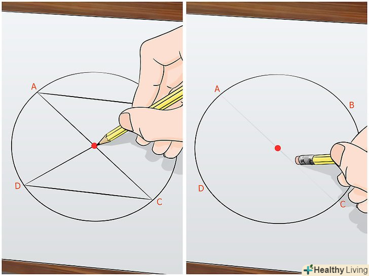 Знайдіть центр кола.якщо ви правильно провели всі відрізки (хорди), то центр кола – це точка перетину хорд AC і BD.[4] позначте центр кола ручкою або олівцем. Якщо вам потрібно відзначити тільки центр кола, зітріть чотири хорди, які ви провели раніше.