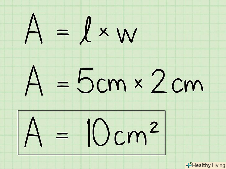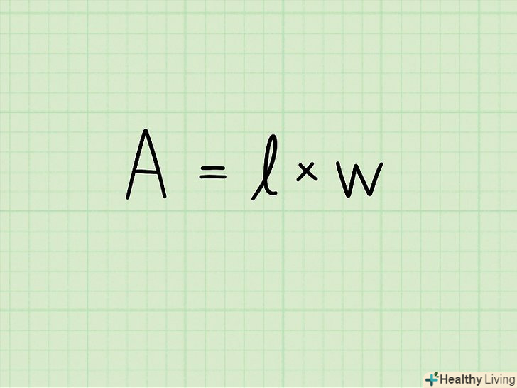 Запишіть формулу для обчислення площі прямокутника:S = L x w .[5]у цій формулі S — площа, l — довжина прямокутника, w — ширина прямокутника. Одиницями вимірювання площі є квадратні одиниці вимірювання довжини, наприклад, квадратні метри, квадратні сантиметри і так далі.- Одиниці виміру площі записуються так: м2, см2 і так далі.
