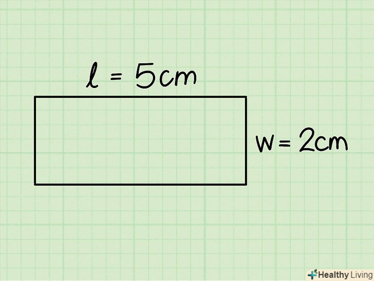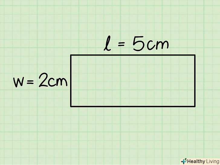 Знайдіть довжину і ширину прямокутника.довжина прямокутника - це його верхня або нижня сторона. Ширина прямокутника-це одна з його бічних сторін. Виміряйте сторони прямокутника за допомогою лінійки, щоб знайти довжину і ширину.- Наприклад, довжина прямокутника дорівнює 5 см, а ширина дорівнює 2 см.