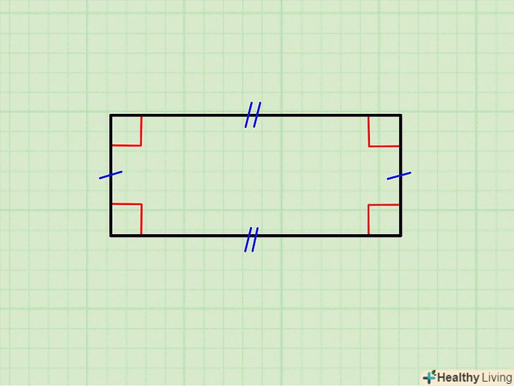 Переконайтеся, що в задачі дано прямокутник (показаний на малюнку).Пам'ятайте, що у прямокутника протилежні сторони паралельні і рівні (верхня і нижня сторони, а також бічні сторони). Більш того, бічні сторони перпендикулярні (перетинають під 90°) верхній і нижній сторонам.[4]- Якщо у фігури всі сторони рівні, в задачі дано квадрат. Квадрат є окремим випадком прямокутника.