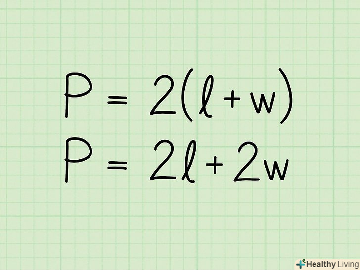 Запишіть формулу для обчислення периметра прямокутника:P = 2 (l + w) .[6]у цій формулі Р — периметр, l — довжина прямокутника, w — ширина прямокутника. Іноді дана формула записується так: P = 2L + 2W (ці формули ідентичні один одному, але форма запису у них різна).- Одиницями вимірювання периметра є одиниці виміру довжини, наприклад, метри, сантиметри і так далі.