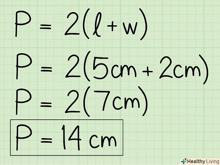 - У нашому прикладі: P = 2L + 2W = (2 x 2) + (2 x 5) = 4 + 10 = 14 см.
