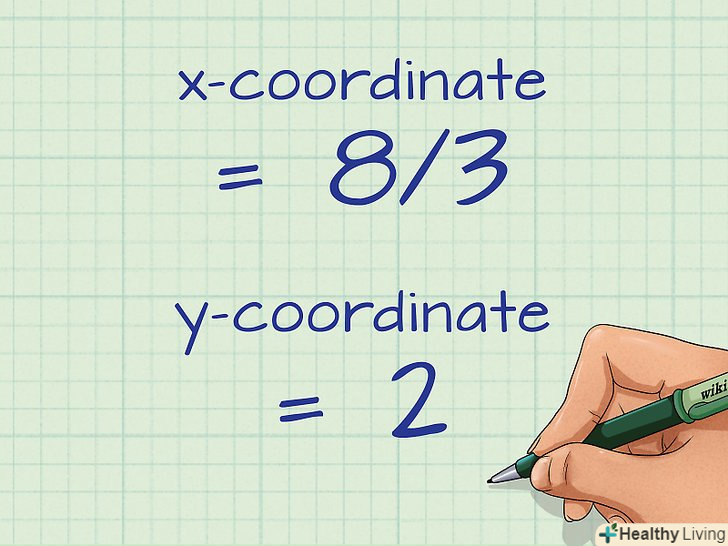 Знайдіть середні значення сум координат «х» і «у».отримані значення будуть відповідати центру тяжіння трикутника.[5] щоб знайти середнє значення, розділіть кожну суму на 3.- Наприклад, якщо сума координат «х» дорівнює 8, то середнє значення дорівнює