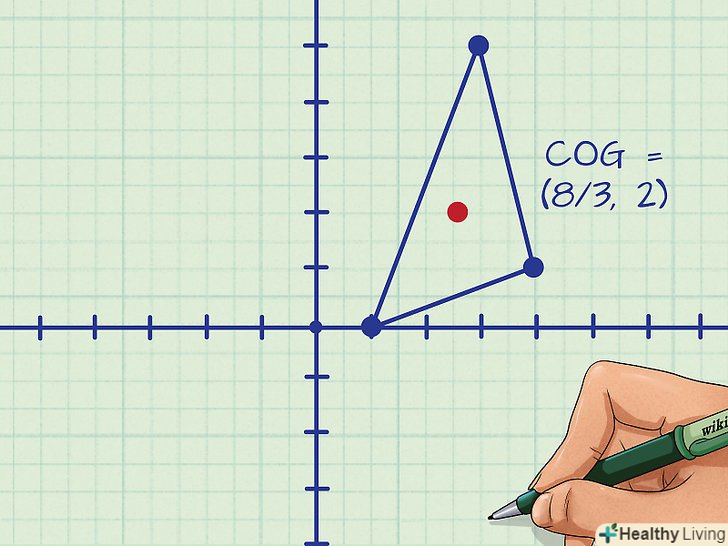 Нанесіть точку центру тяжіння на трикутник. Центр ваги знаходиться в точці, координати якої рівні середнім значенням Сум координат "х»і "у".- У нашому прикладі центр ваги – це точка з координатами