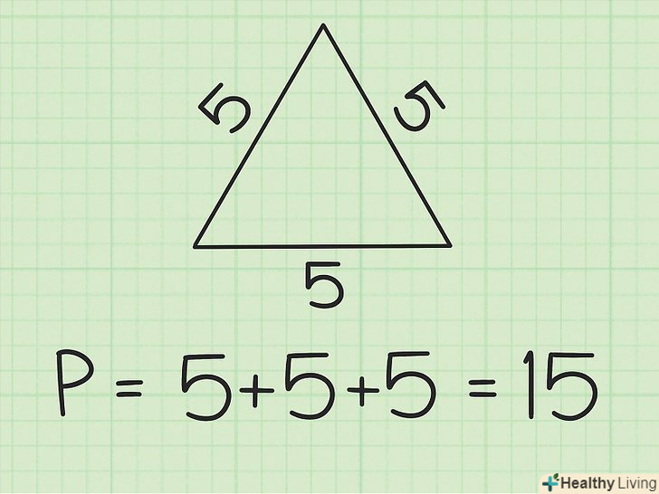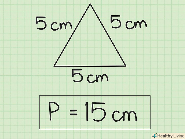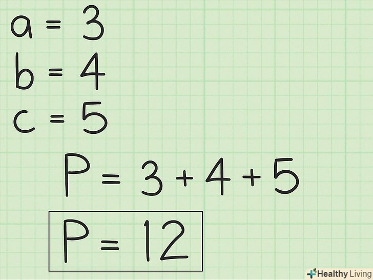 Складіть довжини всіх трьох сторін, щоб знайти периметр. у нашому прикладі 5 + 5 + 5 = 15, тобто P = 15.- Розглянемо інший приклад:A = 4,B = 3 іC=5. У цьому випадку периметр дорівнює: P = 3 + 4 + 5 = 12.