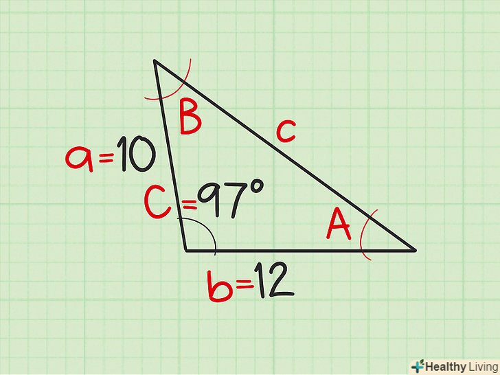 Дайте позначення сторонам і кутам трикутника.позначте першу відому сторону як A, а протилежний їй кут — як A. Другу відому сторону і протилежний їй кут позначте відповідно . Відомий кут між цими сторонами позначте якC, а протилежну йому сторону, довжину якої необхідно знайти, — якC.- Припустимо, дано трикутник зі сторонами 10 і 12 і кутом між ними 97°. У цьому випадку маємо:A = 10, B = 12, C = 97°.
