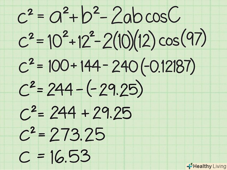 Підставте відомі значення в формулу і знайдіть невідому сторонуЗ.спочатку зведіть в квадрат довжини відомих сторін і складіть отримані значення. Потім знайдіть косинус кута С за допомогою звичайного або онлайн-калькулятора.[5] помножтеCos(C) на2AB і відніміть отримане число з сумиA2 + b2 . В результаті ви отримаєте C2. Витягніть квадратний корінь, щоб знайти довжину невідомої сторони. У нашому прикладі маємо:- C2 = 102 + 122 – 2 × 10 × 12 × cos(97°).