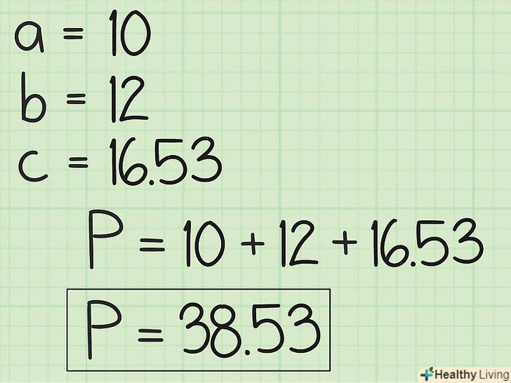 Складіть довжини трьох сторін, щоб знайти периметр.як ми пам'ятаємо, периметр обчислюється за формулою:P = a + b + c. Після того як ми знайшли довжини сторін A, B і C, необхідно скласти їх, щоб визначити периметр.- У першому прикладі:P = 3 + 4 + 5 = 12.