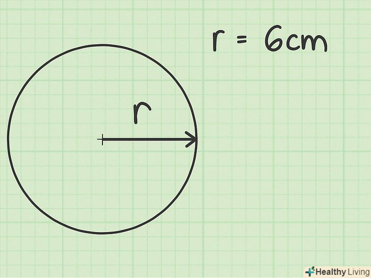 Знайдіть радіус кола.радіус-це відрізок, що з'єднує центр кола з будь-якою точкою зовнішнього кола кола. Радіус можна виміряти в будь-якому напрямку: він буде одним і тим же. Радіус також дорівнює половині діаметра кола. Діаметр-це відрізок, який проходить через центр кола і з'єднує дві точки зовнішнього кола кола.[1]- Як правило, значення радіуса дано в умовах завдання. Досить важко знайти точний центр кола, якщо тільки він не позначений на колі, який намальований на папері.