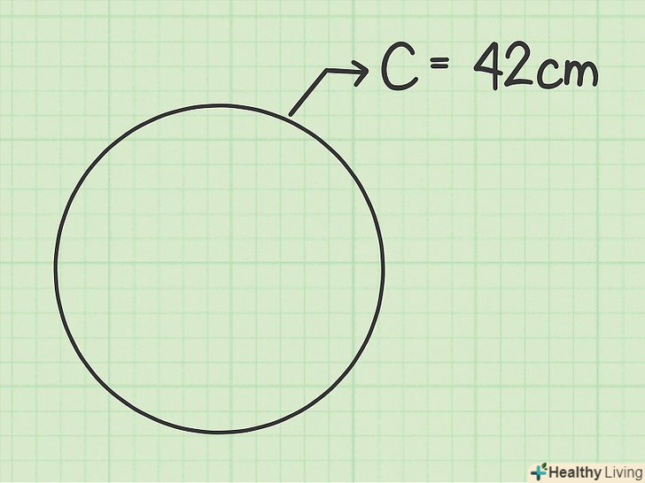 Виміряйте або запишіть довжину кола.у деяких ситуаціях не можна точно виміряти діаметр або радіус. Якщо діаметр не намальований або центр не відзначений, дуже складно знайти точний центр кола. Довжину кола деяких предметів (наприклад, сковороди) досить легко виміряти за допомогою рулетки, тобто можна знайти більш точне значення довжини кола, ніж діаметра.[5]- Наприклад, довжина кола кола (або круглого предмета) дорівнює 42 см.