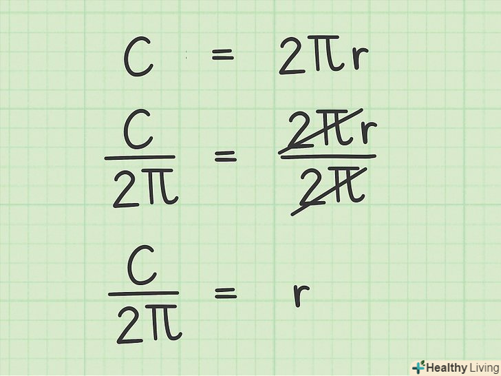 Використовуйте співвідношення між довжиною кола і радіусом, щоб переписати формулу.довжина кола дорівнює добутку числа Пі на діаметр. Це можна записати так:. Нагадаємо, що діаметр дорівнює подвоєному радіусу, тобто