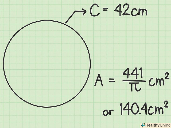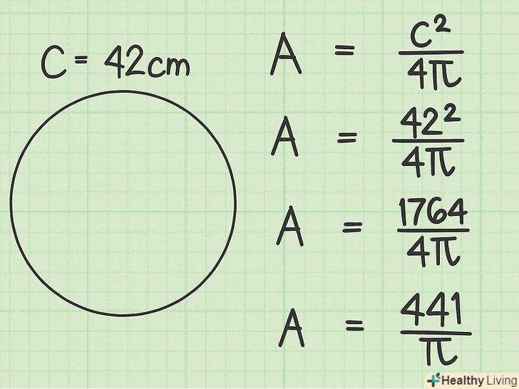 Скористайтеся перетвореною формулою, щоб вирішити задачу.тепер у формулі замість радіуса присутня довжина кола, тому можна обчислити площу кола по відомій довжині кола. Підставте значення довжини кола і виконайте обчислення наступним чином:[8]- У нашому прикладі