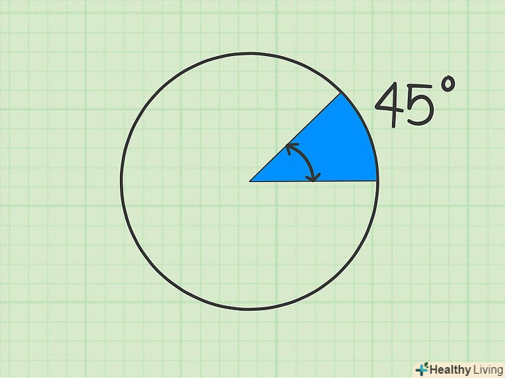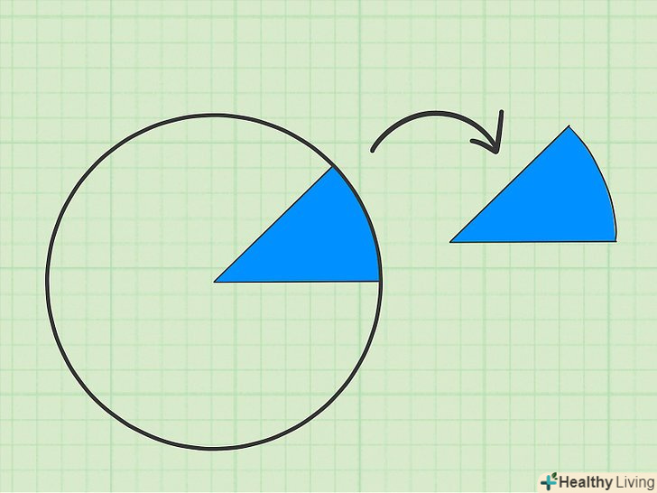 Виміряйте центральний кут сектора.скористайтеся транспортиром, щоб виміряти кут між двома радіусами. Лінійку (прямолінійну шкалу) поєднайте з одним з радіусів, причому центр лінійки повинен збігатися з центром кола. Потім знайдіть величину кута; для цього подивіться на точку перетину другого радіуса з кутомірної шкалою.[12]- Не переплутайте внутрішній і зовнішній кут між двома радіусами. У завданні має бути зазначено, з яким кутом працювати. Пам'ятайте, що сума внутрішнього і зовнішнього кутів дорівнює 360 градусів.