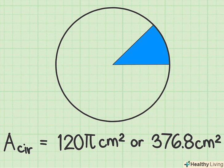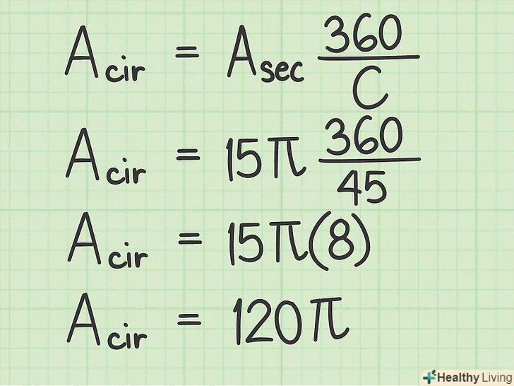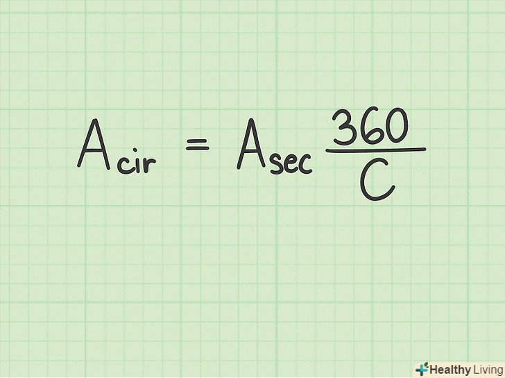 Використовуйте перетворену формулу для обчислення площі кола. якщо відомі площа сектора і його центральний кут, використовуйте наступну перетворену формулу, щоб знайти площу кола: [13]– площа кола
