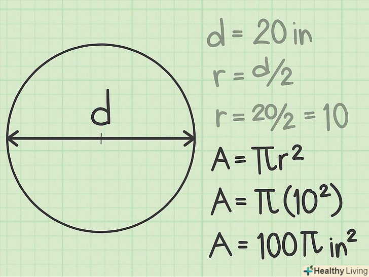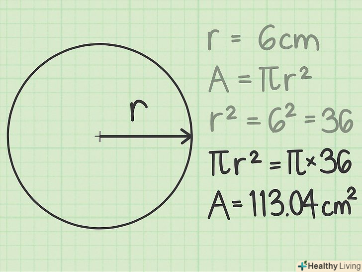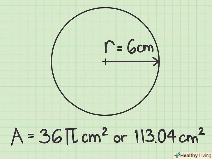 Скористайтеся стандартною формулою для обчислення площі кола. знайшовши радіус, скористайтеся формулою, щоб обчислити площу круга. Підставте значення радіуса і виконайте обчислення наступним чином: