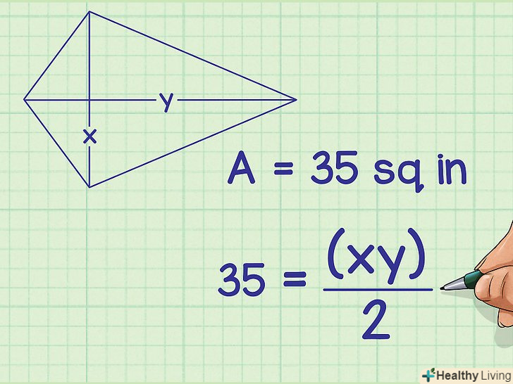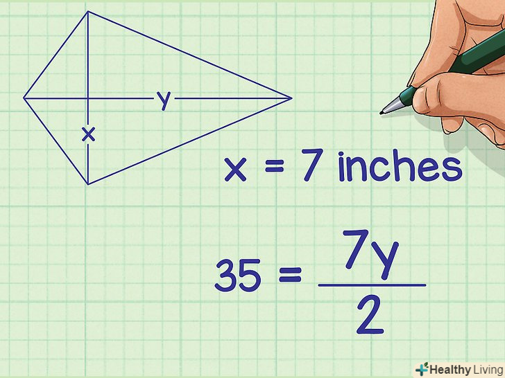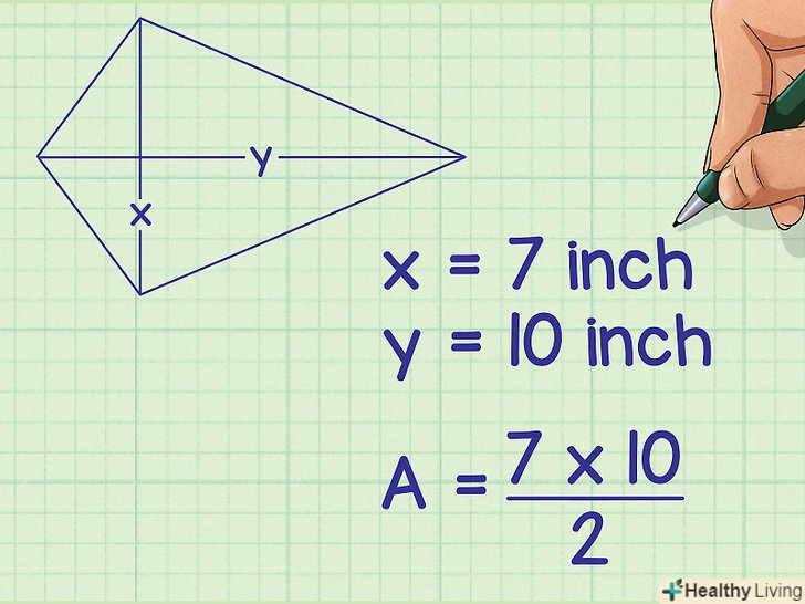 Підставте значення діагоналей в формулу. діагональ-це відрізок, який з'єднує протилежні вершини.[4] Довжина діагоналей буде дана або їх можна буде виміряти. Якщо ви не знаєте довжину діагоналі, не користуйтеся цим методом.- Наприклад, якщо діагоналі змія рівні 7 см і 10 см, формула запишеться так: