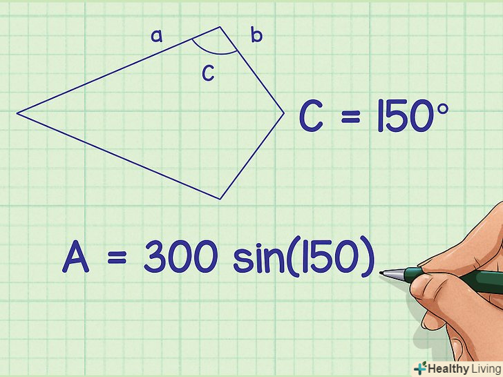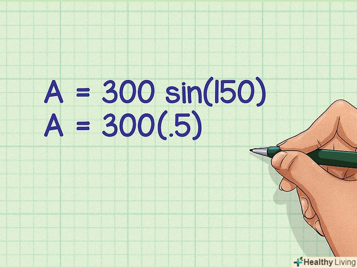Знайдіть синус кута.для цього використовуйте калькулятор або тригонометричні таблиці.[6]- Наприклад, синус кута 150 градусів дорівнює 0,5, тому формула запишеться так: