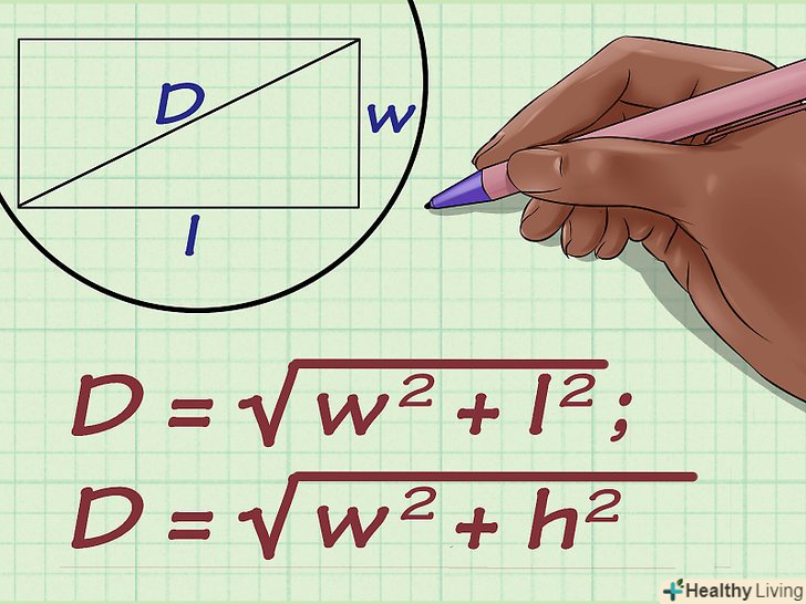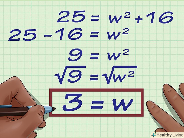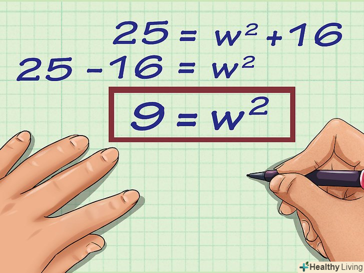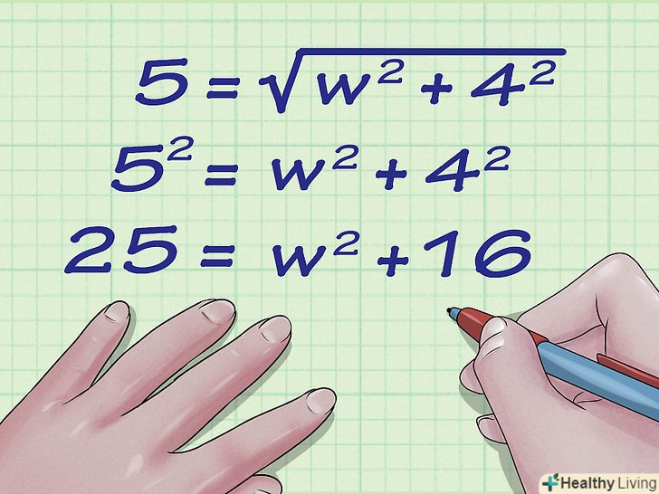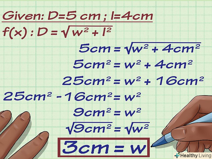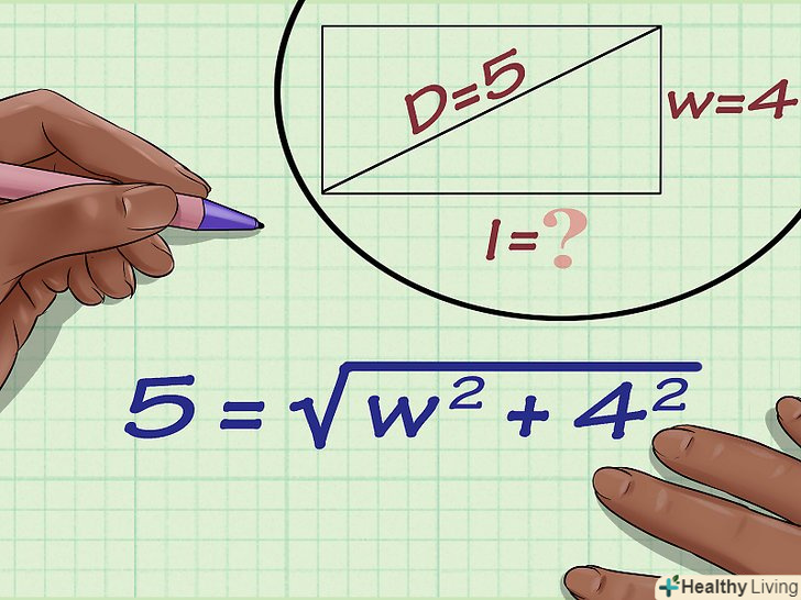 У формулу підставте дані значення діагоналі і довжини.переконайтеся, що підставляєте числа замість відповідних їм змінних.- Наприклад, знайдіть ширину прямокутника, діагональ якого дорівнює 5 см, а довжина 4 см. У цьому випадку формула запишеться так: