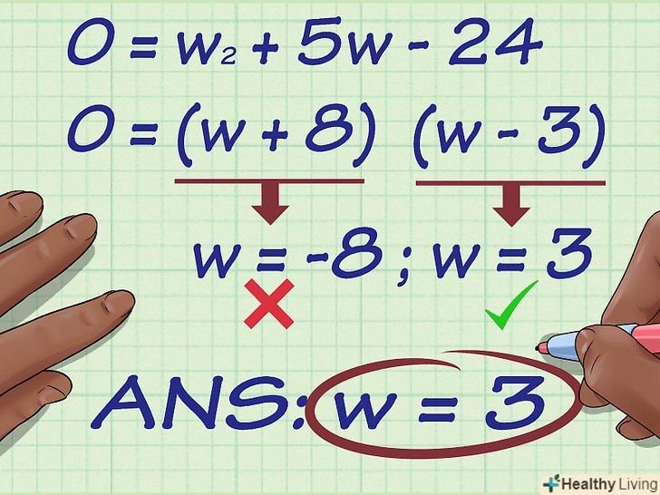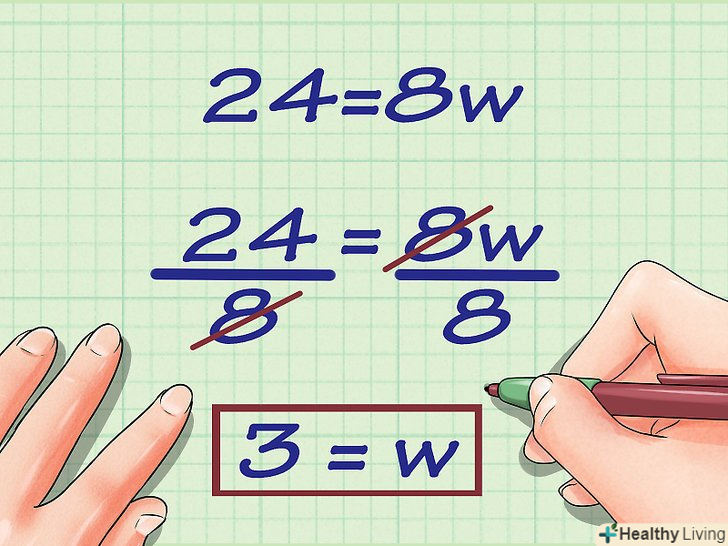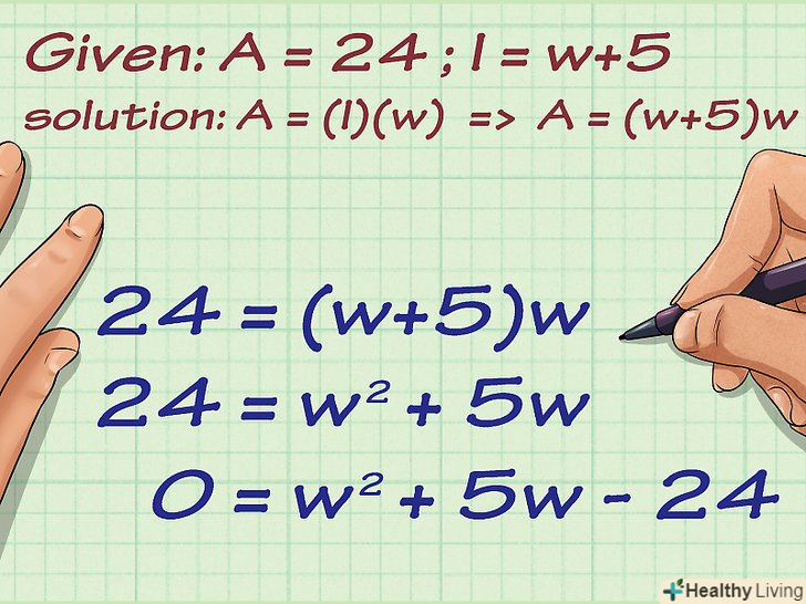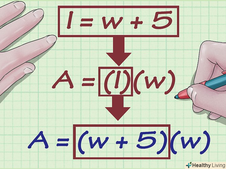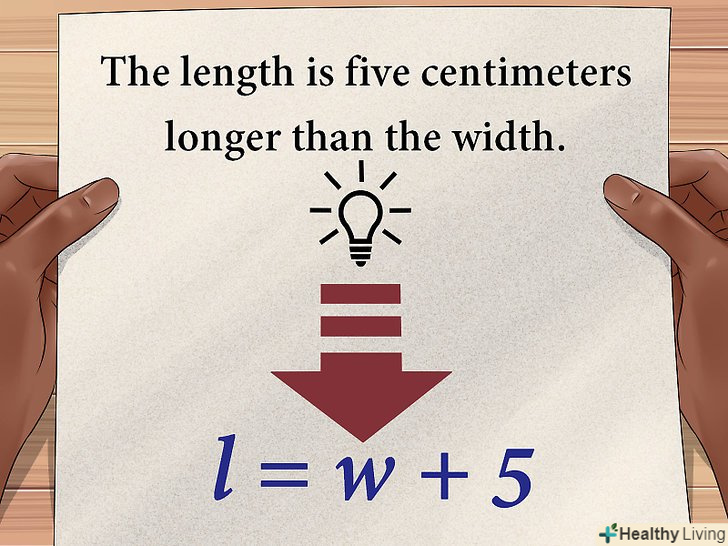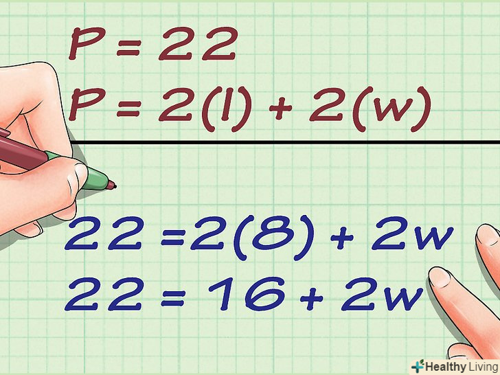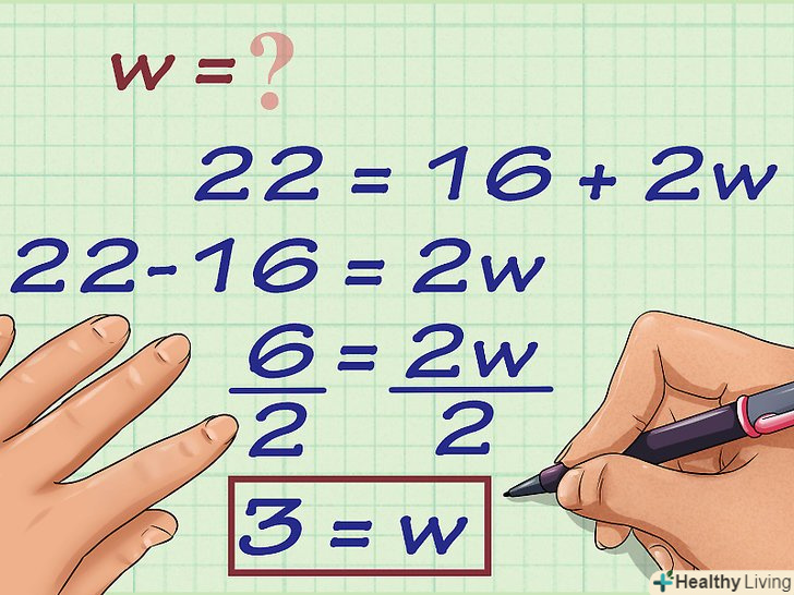 Спростіть рівняння.Вид спрощеного рівняння залежить від співвідношення між довжиною і шириною і обраної формули (для обчислення площі або периметра).[7] Спростіть рівняння так, щоб з легкістю знайти значення змінної.