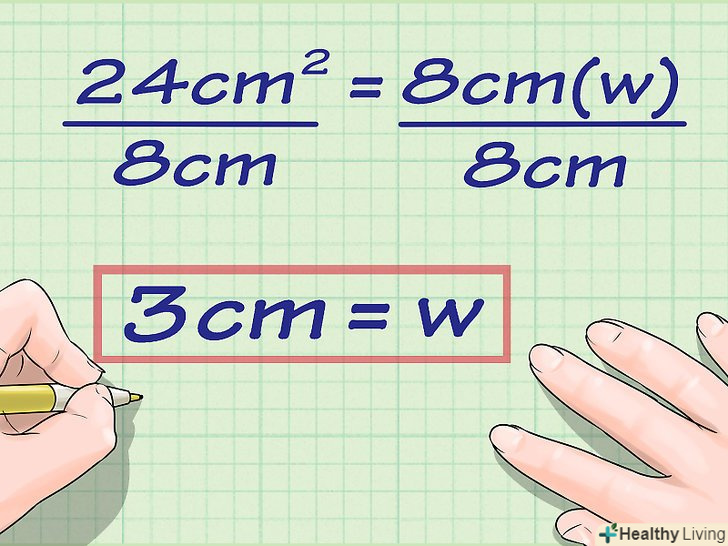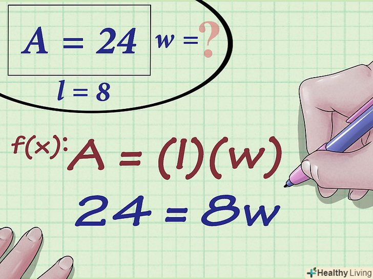 У формулу підставте дані значення площі і довжини.переконайтеся, що підставляєте числа замість відповідних їм змінних.- Наприклад, знайдіть ширину прямокутника, площа якого дорівнює 24 квадратних сантиметри, а довжина 8 сантиметрів. У цьому випадку формула запишеться так:
