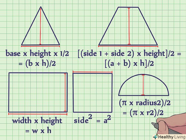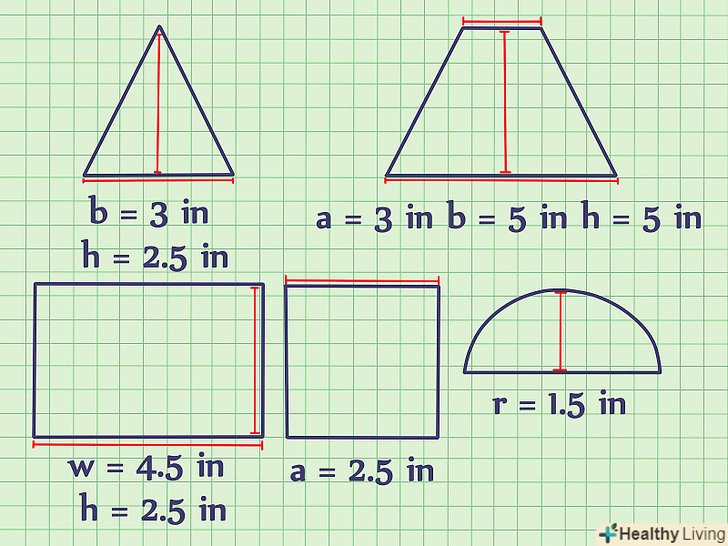 Запишіть формули для знаходження площі кожної з цих фігур.ці формули дозволять вам знайти площі фігур за даними або виміряними величинами.- Площа квадрата: S = a2, де а – сторона квадрата.