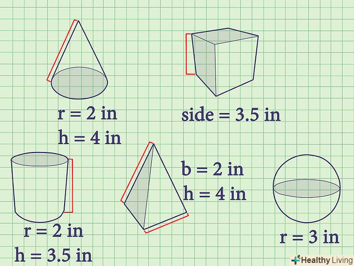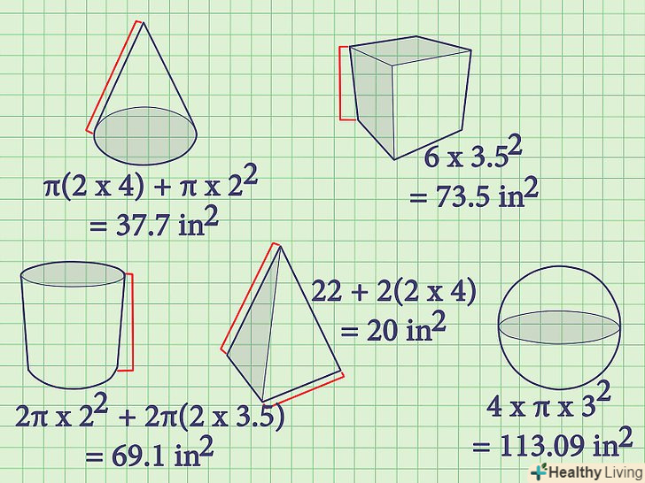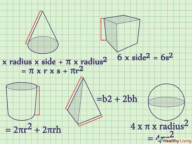 Запишіть формули для знаходження площі поверхні різних фігур. площа поверхні-це загальна площа, займана поверхнею фігури, будучи спроектованої на двовимірну площину. Кожна тривимірна фігура має площу поверхні. Ось формули для знаходження площі поверхні різних об'єктів:- Куб: S = 6s2, де s – сторона куба.