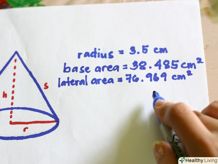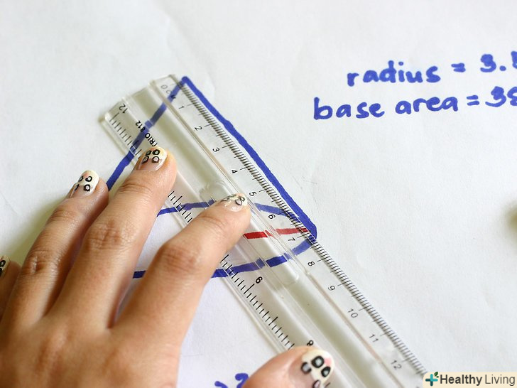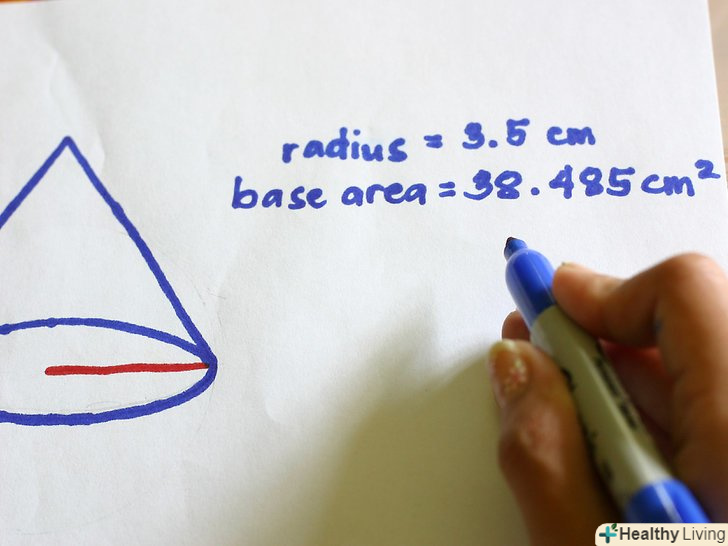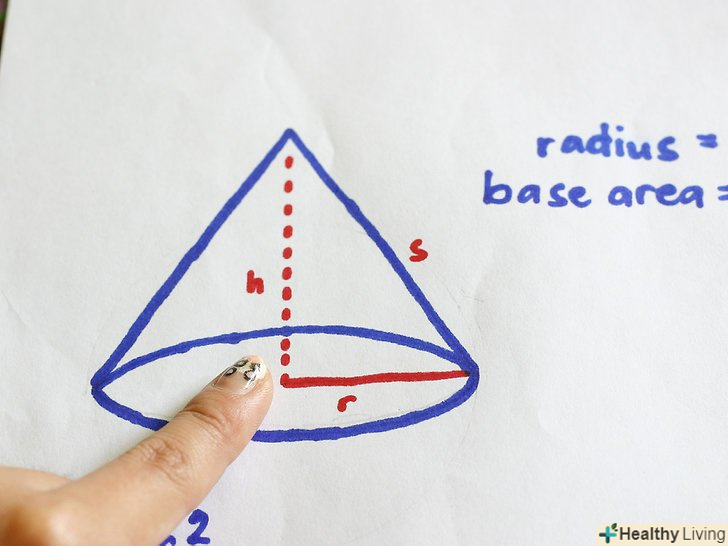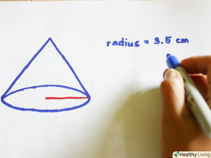 Дізнайтеся радіус основи конуса.якщо у вас є діаметр, розділіть його на два, щоб отримати радіус. Якщо у вас є довжина по утворює конуса і довжина перпендикуляра, використовуйте теорему Піфагора.