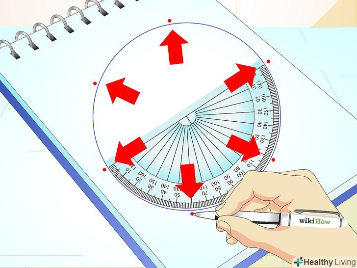 За допомогою транспортира нанесіть точки на Кола на відстанях, відповідних кожному куту.іншими словами, поставте початкову точку, потім відміряйте від неї розрахований кут і поставте наступну точку, і так пройдіть уздовж всього кола, проставивши на ній точки, відповідні кожному прирощенню кута.- Наприклад, якщо ви малюєте шестикутник, поставте початкову точку в будь-якому місці кола, потім відміряйте від неї кут 60 градусів і поставте другу точку на окружності, і так далі, поки не пройдете всю окружність. В результаті у вас вийде 6 точок.