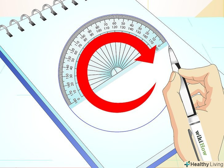 Накресліть на папері коло, обводячи округлу частину транспортира.оскільки транспортир має півколо, вам доведеться поєднати дві півкола, зазначивши при цьому їх кінці і центр кола. Намалюйте спочатку одну півколо, обвівши дугу транспортира, потім розгорніть транспортир, поєднайте його центр і краю з центром і крайніми точками проведеної дуги, і знову обведіть край транспортира.