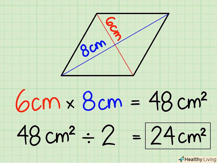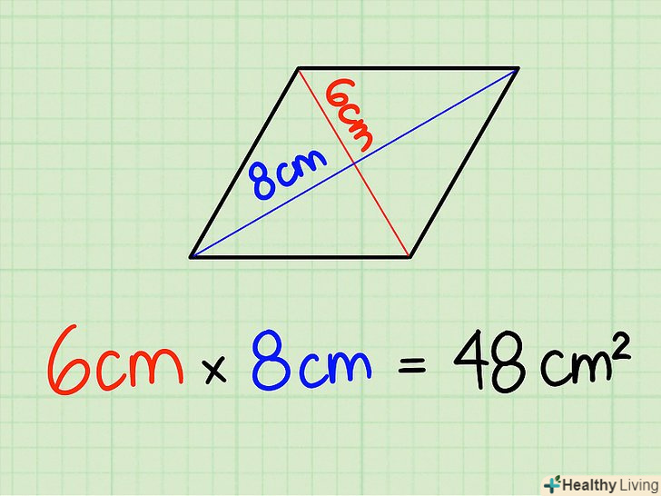 Перемножте довжину діагоналей.запишіть довжину і помножте одне число на інше. У нашому випадку це складе 6 см x 8 см = 48 см2. Не забувайте вказувати квадратні одиниці, так як ви працюєте з квадратною площею.