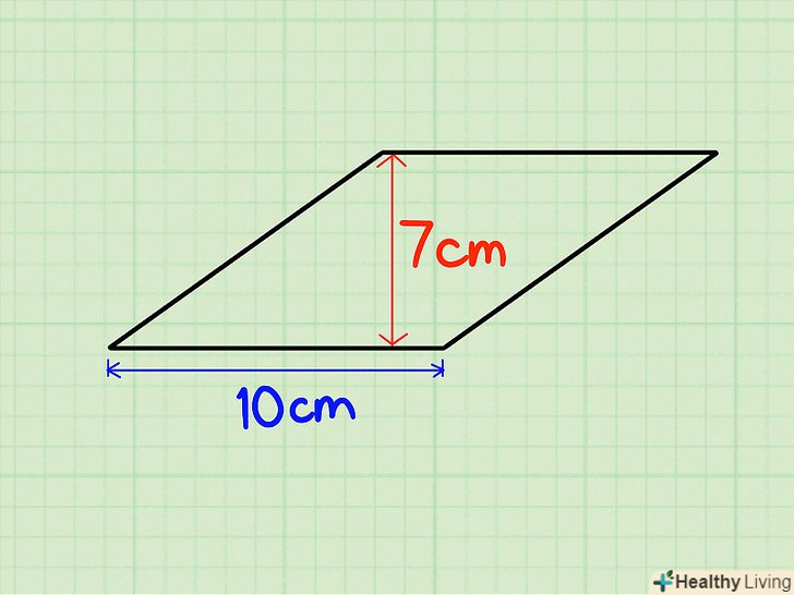 Визначте основу і висоту.ви можете також подумати про це як про множення висоти ромба на довжину сторони. Скажімо, висота ромба становить десять сантиметрів, а підстава — сім сантиметрів.