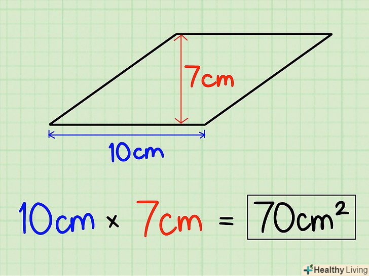 Перемножте підставу і висоту.знаючи підставу і висоту ромба, вам залишається тільки помножити одне на інше. 10 см x 7 см = 70 см2. Площа нашого ромба становить 70 см2.