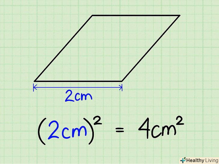 Зведіть довжину однієї сторони в квадрат.у ромба є чотири рівні сторони, так що не важливо, яку саме ви виберете. Припустимо, сторона дорівнює двом сантиметрам. 2 см x 2 см = 4 см2.