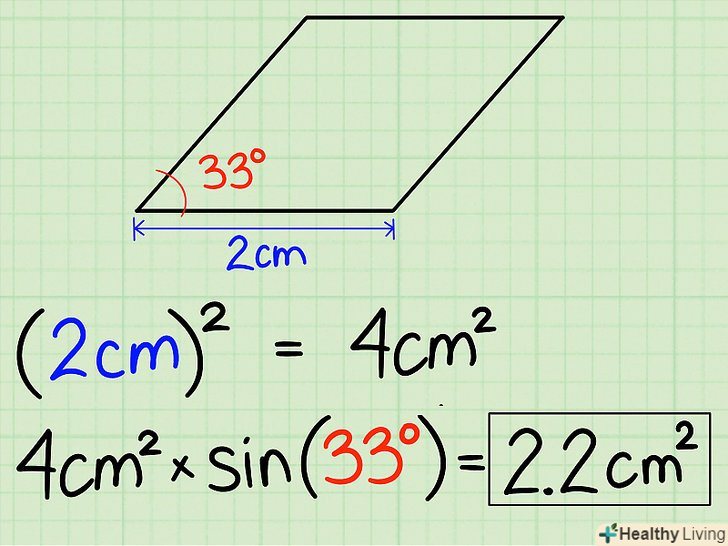 Помножте її на синус одного з кутів, неважливо якого.припустимо, один з кутів становить 33 градуси. Помножте синус (33) на 4 см2 — і ви отримаєте площу ромба. (2 см) 2 x синус (33) = 4 см2 x 1 = 4 см2. Площа нашого ромба становить 4 см2.