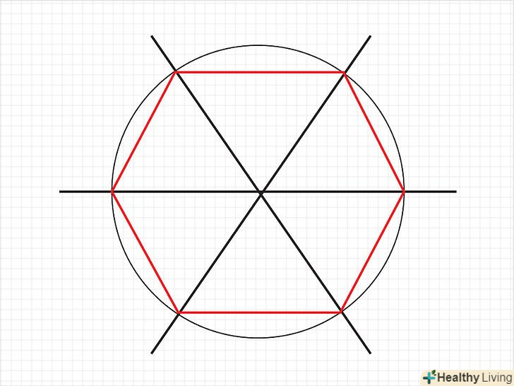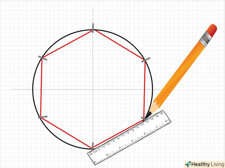 З'єднайте позначки за допомогою лінійки.шість місць, де ваші позначки перетинаються з краєм кола, - це шість вершин шестикутника. За допомогою лінійки і олівця намалюйте прямі лінії, поєднуючи сусідні позначки.