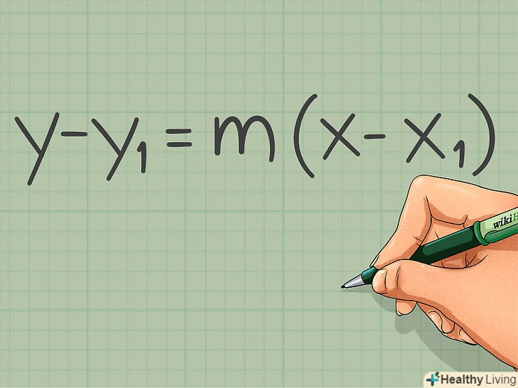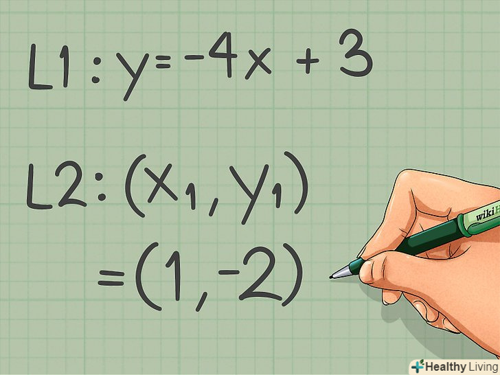 Запишіть рівняння. наступне рівняння дозволить знайти рівняння паралельної (другої) прямої, якщо дано рівняння першої прямої і координати точки, яка лежить на шуканої паралельної( другої) прямої: y - y1= k (x-x1), де k – кутовий коефіцієнт, x1 і y1 – координати точки, що лежить на шуканої прямої, " х " і " у» – змінні, що визначаються координатами точок, які лежать на першій прямій.[9]- Наприклад: знайдіть рівняння прямої, яка паралельна прямій у = -4x + 3 і яка проходить через точку з координатами (1, -2).