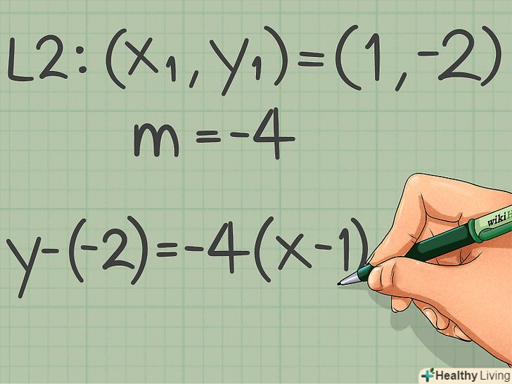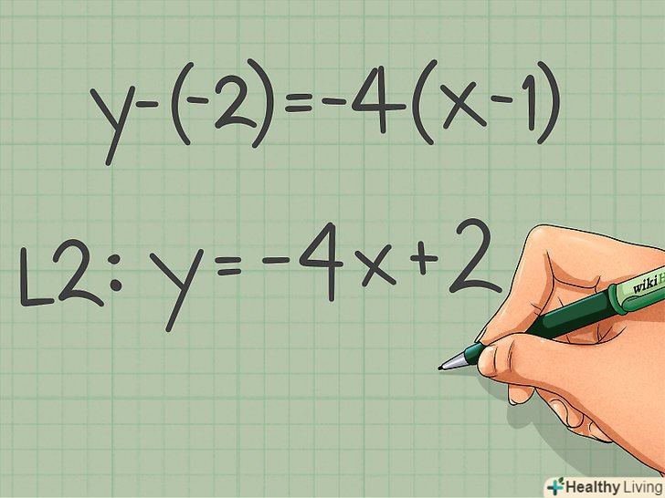 Запишіть рівняння другої прямої. для цього відомі значення підставте в рівняння y – y1= k(x – x1). Підставте знайдений кутовий коефіцієнт і координати точки, що лежить на другій прямій.- У нашому прикладі k = -4, а координати точки (1, -2): у - (-2) = -4 (х - 1)