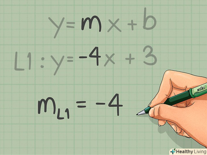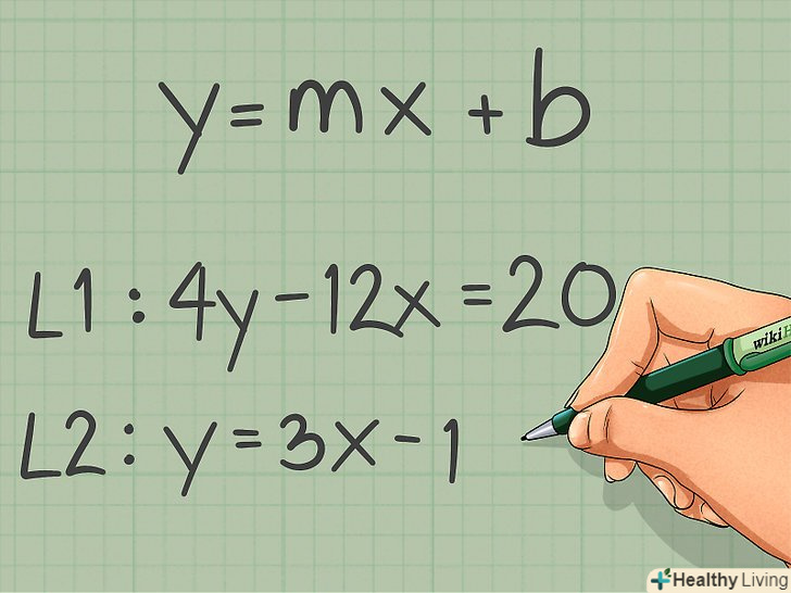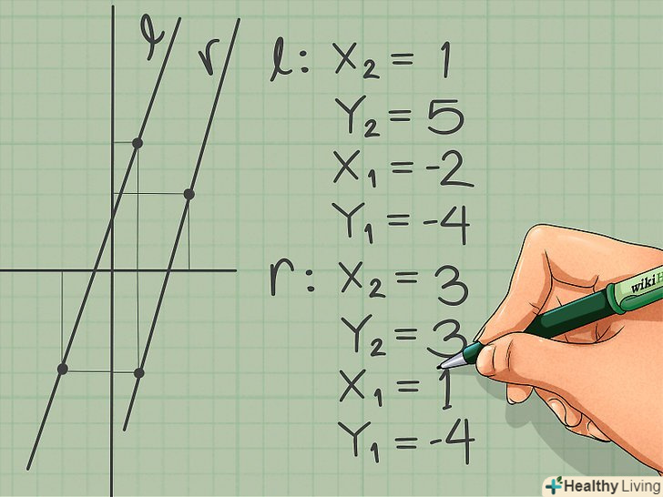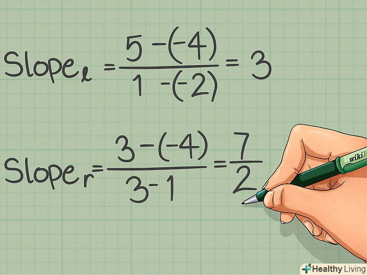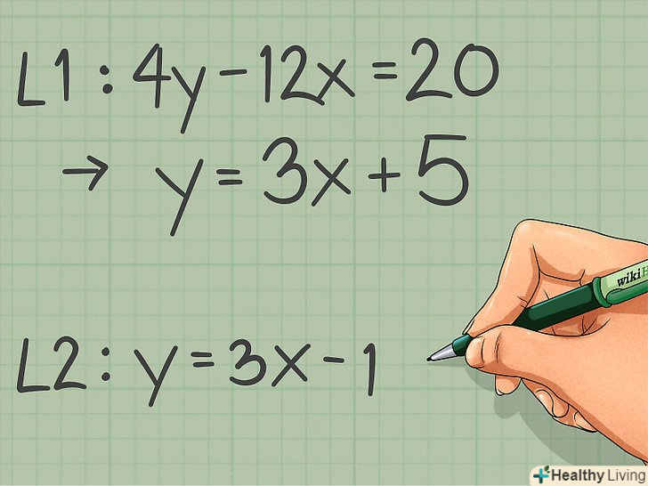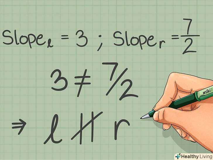 Порівняйте кутові коефіцієнти.Пам'ятайте, що у паралельних прямих кутові коефіцієнти рівні. На малюнку прямі можуть здаватися паралельними, але якщо кутові коефіцієнта не рівні, такі прямі не паралельні один одному.[6]- У нашому прикладі 3 Не дорівнює 7/2, тому дані прямі не є паралельними.