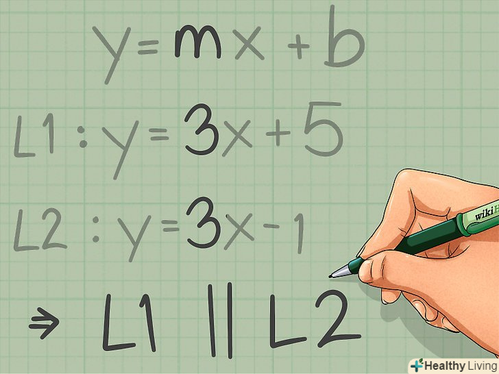 Порівняйте кутові коефіцієнти.Пам'ятайте, що у паралельних прямих кутові коефіцієнти рівні. За допомогою рівняння y = kx + b, де k-кутовий коефіцієнт, можна знайти і порівняти кутові коефіцієнти двох прямих.- У нашому прикладі перша пряма описується рівнянням у = 3x + 5, тому кутовий коефіцієнт дорівнює 3. Друга пряма описується рівнянням у = 3x-1, тому кутовий коефіцієнт теж дорівнює 3. Так як кутові коефіцієнти рівні, дані прямі паралельні.