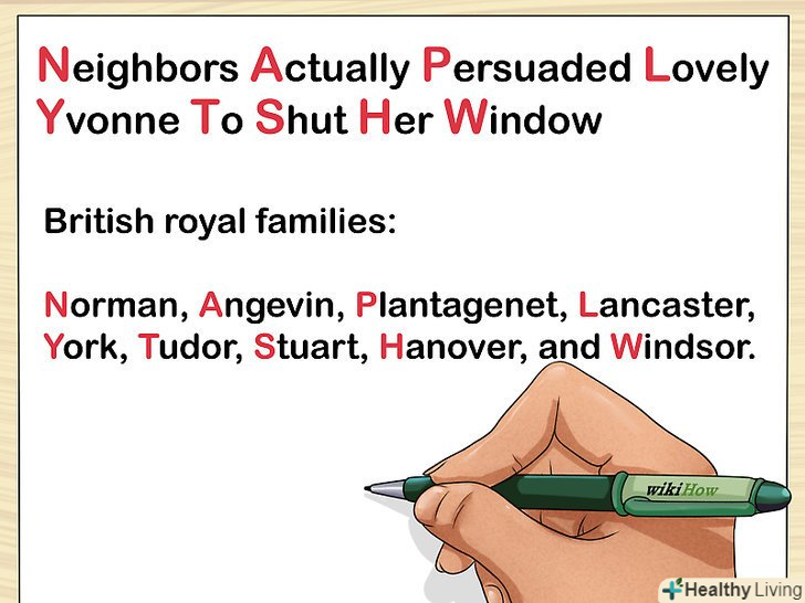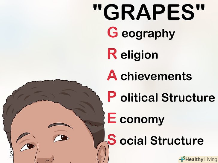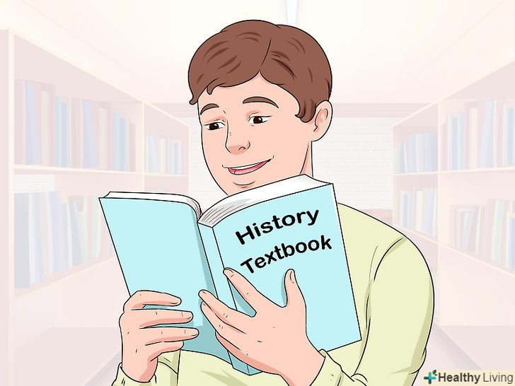 Запам'ятовуйте факти за допомогою мнемонічних прийомів.Запам'ятовувати факти нудно, але прості і швидкі мнемонічні методи допоможуть внести в роботу різноманітність. Крім іншого, вони допомагають краще запам'ятовувати важливу інформацію.- Всім відомий приклад із запам'ятовуванням кольорів веселки: кожен мисливець бажає знати, де сидить фазан. Дотримуйтесь такої ж логіки і складайте фрази з історичними іменами і подіями, які необхідно запам'ятати.[3]