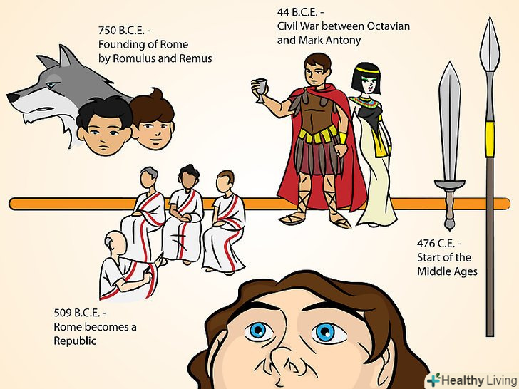 Вивчіть основну хронологію історії Стародавнього Риму.це один з перших кроків, який ви повинні зробити. Вивчення хронології допоможе вам розібратися в безлічі подій, особистостей і періодів, які необхідно знати для розуміння стародавнього Риму. Розглянемо кілька основних подій:- Згідно з легендою, Рим був заснований в 753 році до нашої ери Ромулом і Ремом. В ту епоху римське царство стало великим і могутнім.