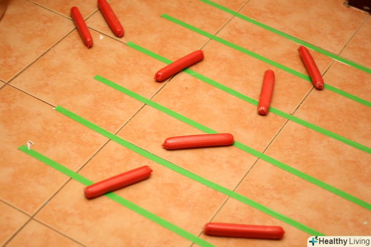 Наклейте на підлогу смужки клейкої стрічки перпендикулярно до напрямку кидка.відстань між двома смужками має дорівнювати довжині хот-дога. Якщо вона близько 15-45 см, наклейте 6-10 смужок; якщо довжина більше – смужок повинно бути менше, і навпаки.