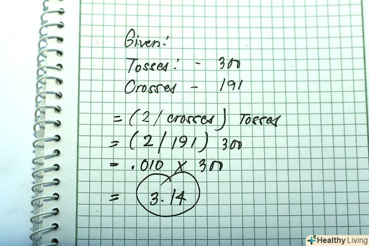 Коли закінчите, розділіть кількість кидків на 2, і розділіть кількість влучень на вийшло число.наприклад, якщо ви кинули їжу 300 разів, і 191 раз вона перетнулася з смужками, розрахунок буде 300/(191/2). На свій подив, в результаті ви отримаєте приблизне значення числа Пі!