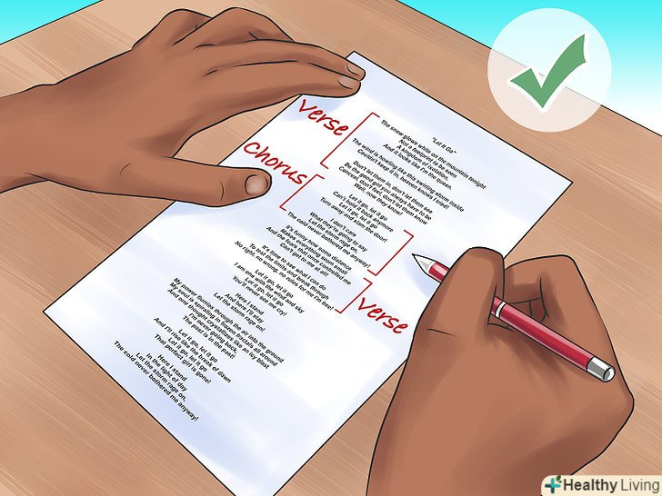 Декламуйте пісню як вірш.це допоможе вам представити її як послідовність ідей або подій. Багато запам'ятовують пісні набагато ефективніше, якщо представляють їх у вигляді історії, а не просто набору Рим.[15]