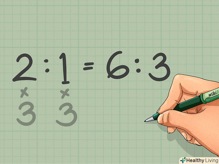 Використовуйте множення або ділення для збільшення або зменшення співвідношення. поширені завдання, в яких необхідно збільшити або зменшити два значення, пропорційних один одному. Якщо вам дано співвідношення і потрібно знайти відповідне йому більше або менше співвідношення, помножте або розділіть вихідне співвідношення на деяке дане число.[4]- Наприклад, пекарю потрібно потроїти кількість інгредієнтів, даних в рецепті. Якщо за рецептом співвідношення борошна до цукру становить 2 до 1 (2:1), то Пекар помножить кожен член співвідношення на 3 і отримає співвідношення 6:3 (6 чашок борошна до 3 чашок цукру).