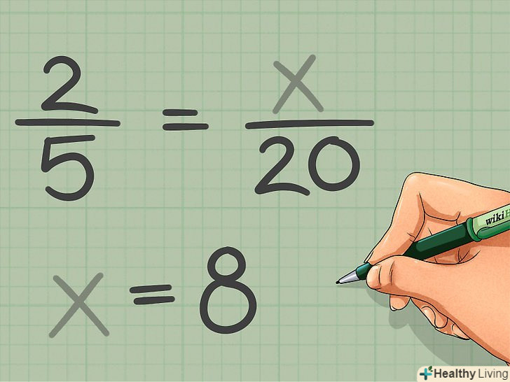 Пошук невідомого значення, коли дані два еквівалентних співвідношення. це завдання, в якому необхідно знайти невідому змінну в одному співвідношенні за допомогою другого співвідношення, яке еквівалентно першому. Для вирішення таких завдань користуйтеся множенням хрест-навхрест. Запишіть кожне співвідношення у вигляді звичайного дробу, поставте між ними знак рівності і перемножте їх члени хрест-навхрест.[5]- Наприклад, дана група учнів, в якій 2 хлопчика і 5 дівчаток. Яке буде число хлопчиків, якщо число дівчаток збільшити до 20 (пропорція зберігається)? По-перше, запишіть два співвідношення - 2 хлопчика:5 дівчаток іХ хлопчиків:20 дівчаток. Тепер запишіть ці співвідношення у вигляді дробів: 2/5 і х/20. Перемножте члени дробів хрест-навхрест і отримаєте 5x = 40; отже, х = 40/5 = 8.